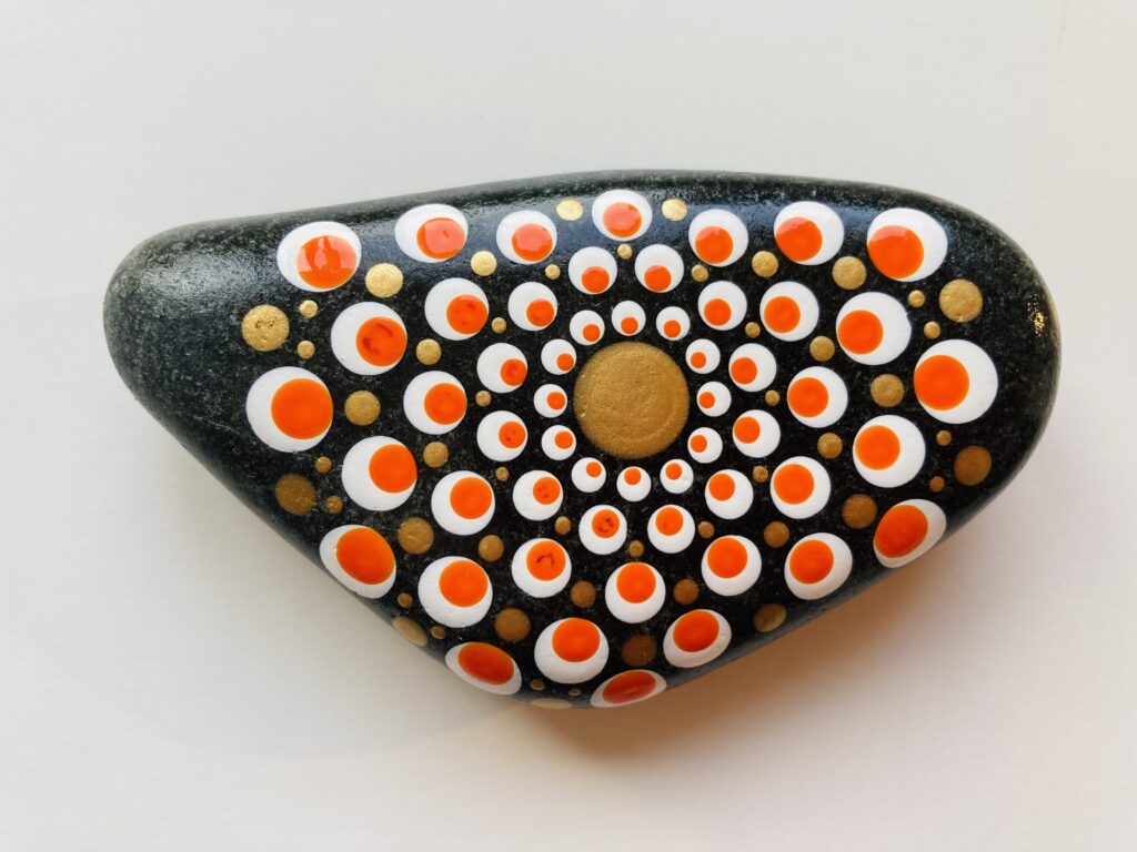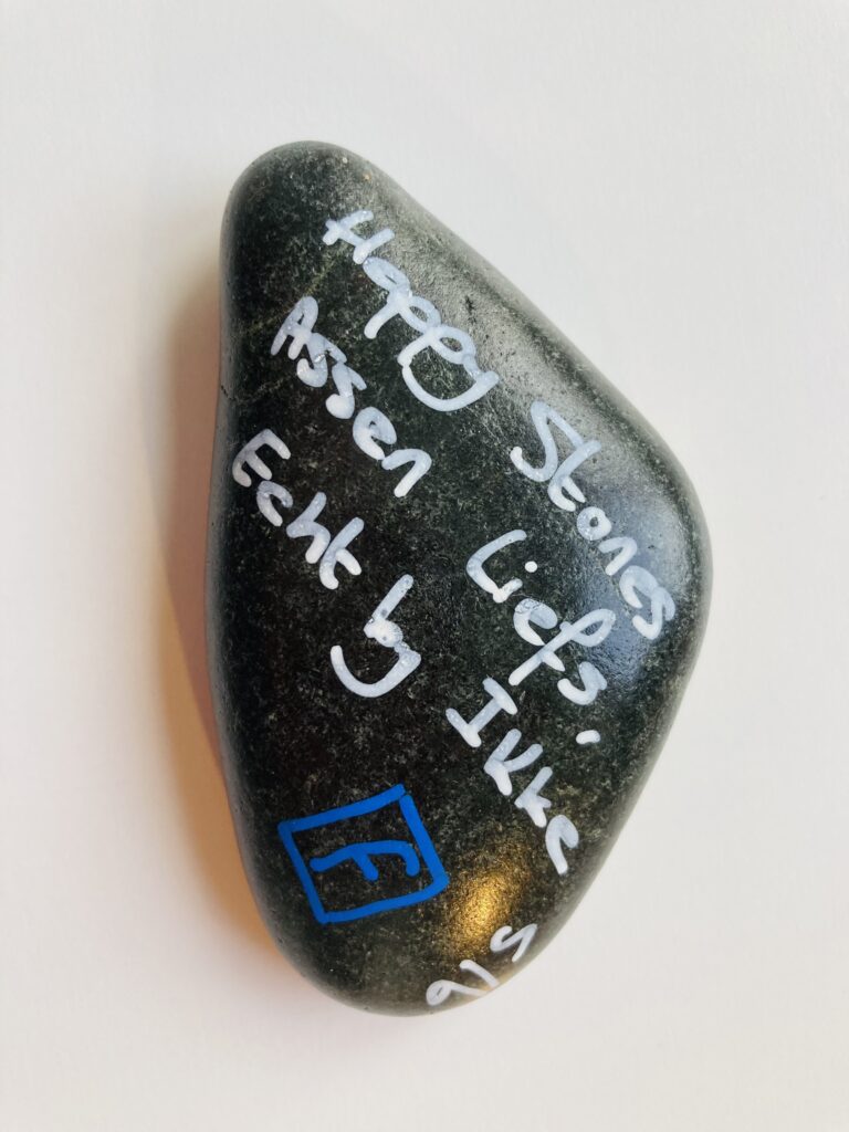 Mijn wandeling duurde niet heel lang. Kennelijk had ik door het schone gezang van alle vogelijnen en het binnenschijnen van de eerste zonnestralen in korte tijd voldoende inspiratie voor deze dag opgedaan. Welgemoed liep ik mijn tuinpad op toen ik links, half onder het bruinrode blad van het purperklokje een Happy Stone zag liggen die mij met goudrode ‘kattenogen’ stralend aanstaarde. Het was een gevoel van herkenning. We waren beide happy. Op de onderkant van de steen die bijna hartvormig was, werd mij ook nog ‘liefs’ gewenst. Wat een prachtig begin van deze dag.