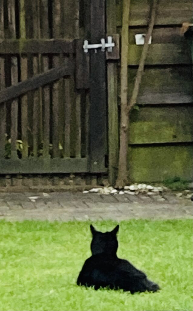 Lotje lijkt altijd verbazingwekkend goed haar routes te weten. Met vaste en zekere tred wandelt zij dan door het tuinhek de wijde wereld in. Niets dat haar kan weerhouden en absoluut zeker van hetgeen gebeuren moet. Ik vraag me wel eens af of zij overdag haar nachtelijke route uitzet. Dan stel ik mij voor hoe ze door de tuinen zwerft om te zien waar wasgoed hangt of tuinhandschoenen na gedane arbeid over een emmer bij de buitenkraan hangen te drogen. Zij lijkt altijd erg zeker van haar zaak.