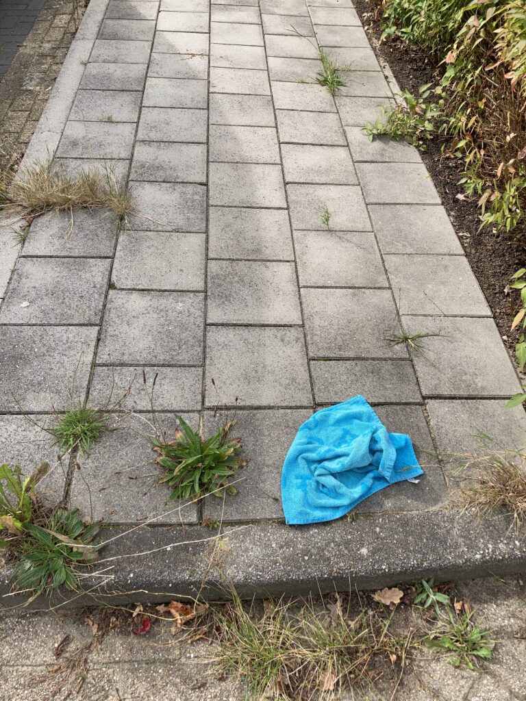 Toch moest ik eergisteren constateren dat ook Lotje soms de weg kwijt is. Toen ik het gangetje achter het huis uit fietste en rechtsaf sloeg zag ik op de stoep bij de kruising een blauwe keukenhanddoek liggen. Het zag er vreemd uit. Zo’n blauwe keukenhanddoek, eenzaam zonder een bijpassende blauwgeruite theedoek. Lotje kwam luid orerend achter mij aan en deed of haar neus bloedde. Ik zag dat dit niet het geval was en duidelijk wel de kleine tandafdrukken in de punt van de blauwe keukenhanddoek. Ze had een blauwtje gelopen. Haar ogen waren te groot geweest. Toch gaat ze door. Waarom? En waarheen? Ik weet het niet. Lots wegen zijn ondoorgrondelijk.