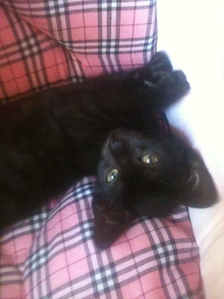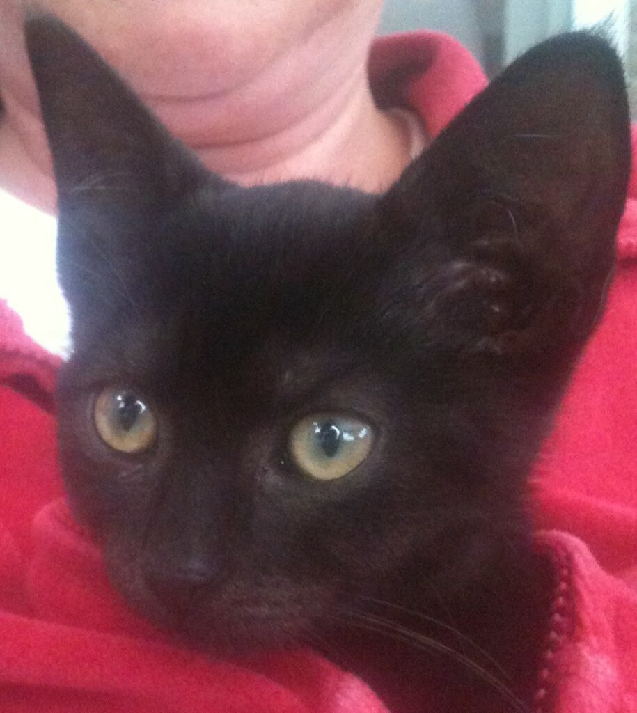 Hetzelfde overkwam mij jaren later. Het was tijd voor een nieuw kattenkind. In mijn fantasie viel ik voor een flinke rode kater. Zo’n Farinelli, de gevierde Italiaanse castraat met een serieus postuur, prachtig zingend en absoluut ongevaarlijk. Een zachte, aandoenlijke rode reus. Daar viel ik voor. In het asiel aangekomen mocht ik mijn entree maken in de kittenkamer. Een grote rode was er op dat moment niet, dus zou het een kleine in ontwikkeling worden. Binnengekomen werd ik overvallen door een wervelstorm van pluizige poezenpootjes. Alle weldenkendheid smolt weg als sneeuw voor de zon. Ik wilde ze allemaal. Hier en nu. Eén welgemiste sprong van een kleine bewoner die met vlijmscherpe nageltjes in mijn rechterdij bleef hangen, bracht mij terug bij zinnen. Eén kat zou volstaan. Mijn blik werd weer helder en op dat moment viel mijn oog op haar. Zwart, rank, als een volleerd mannequin lag zij daar, alleen, op de hoogste ligplaats van een enorme krabpaal. In een aura van zonlicht zag zij met enig misnoegen het geheel aan. Onze ogen vonden elkaar. De boodschap was duidelijk. Mijn handen omvatten haar tengere lijfje en zo lag zij op mijn linkerarm zoals ze even tevoren nog op haar troon lag. Om nooit meer weg te gaan.